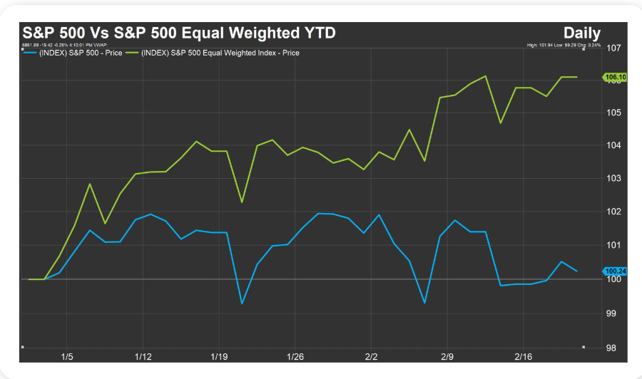 • Markets have been volatile in 2026, while the market’s bellwether index has done a whole lot of nothing, but if you look past the market cap weighted S&P 500 and focus on the equal weighted S&P 500, the performance story brightens considerably.